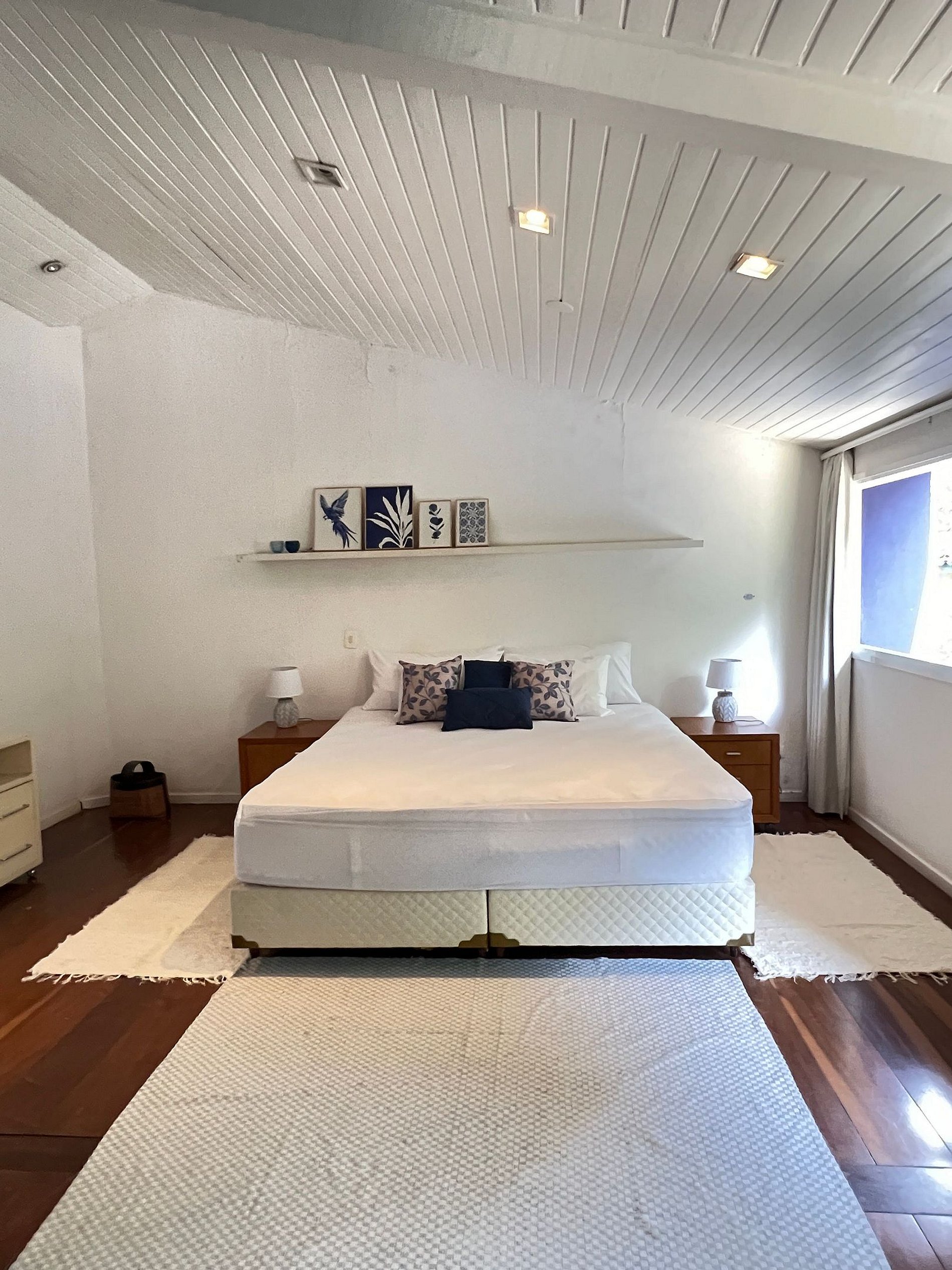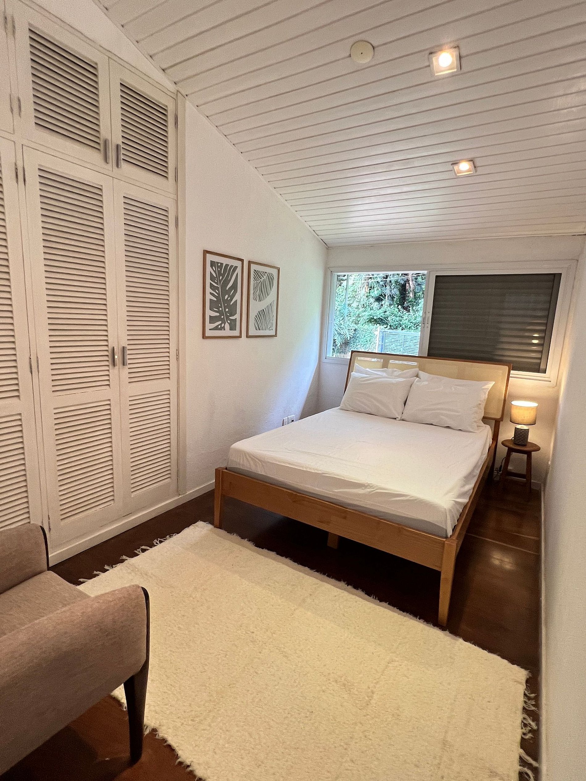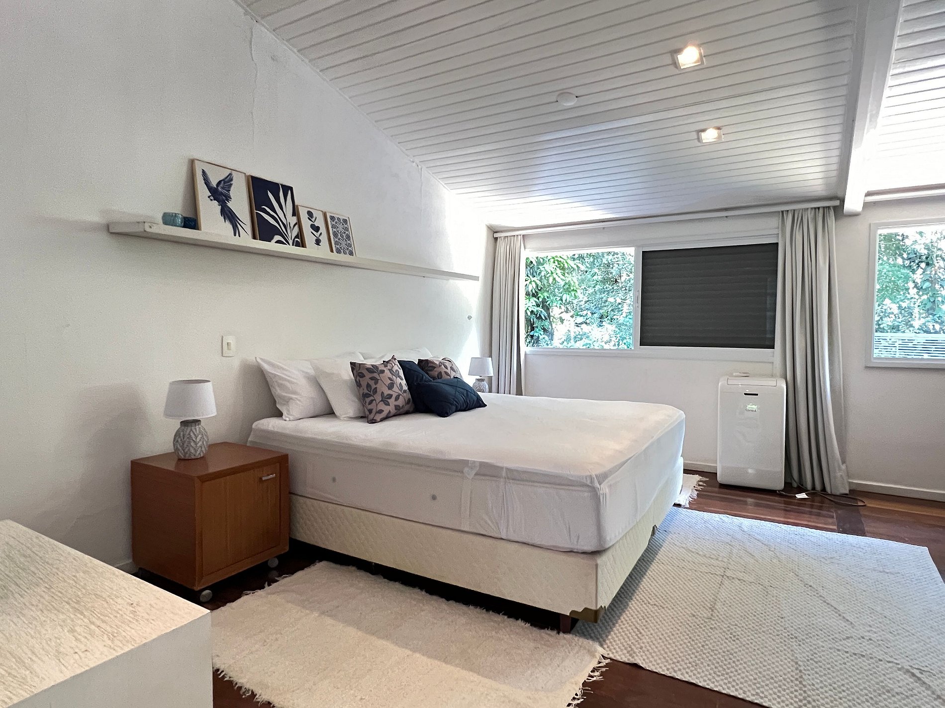- 1 suíte master ampla com cama King Size, ar-condicionado portátil e decoração aconchegante.