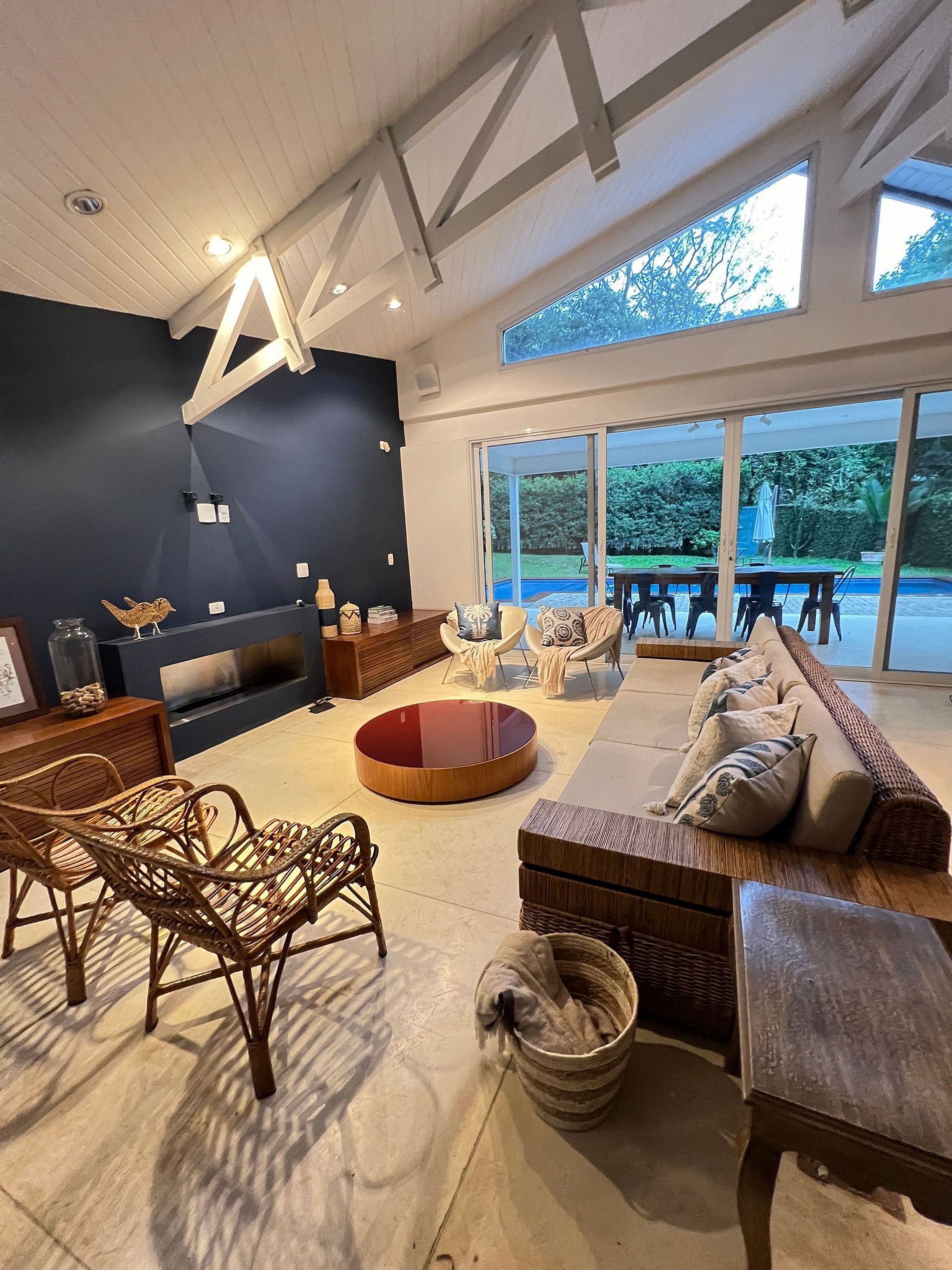 - Sala de estar ampla integrada à sala de jantar, com acesso à varanda e vista para a piscina.