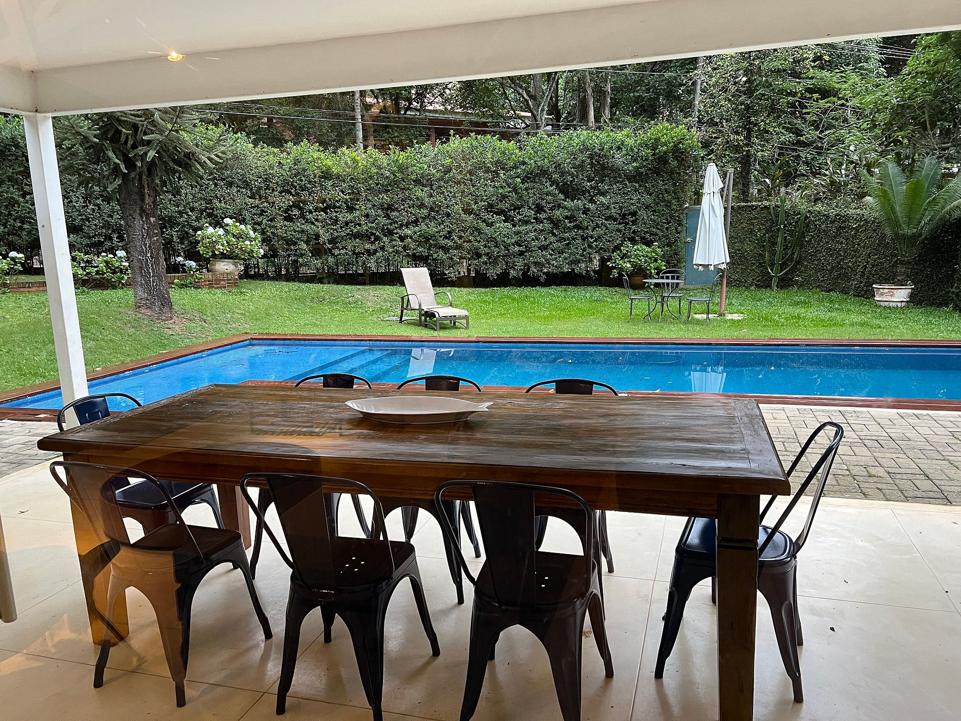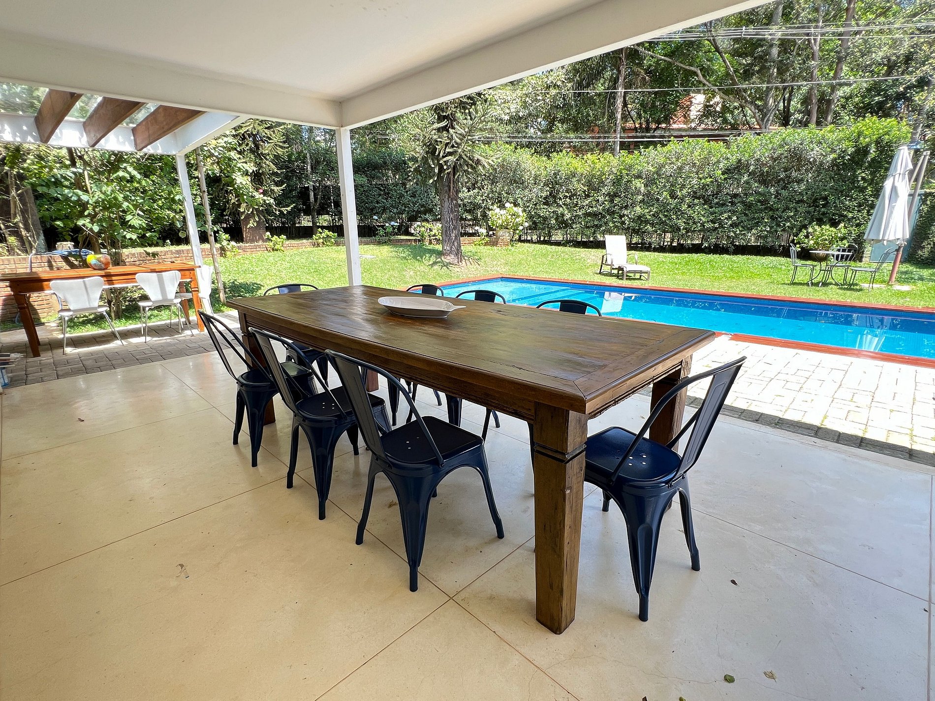 - Varanda espaçosa com mesa de jantar para 8 pessoas e vista para a piscina.
