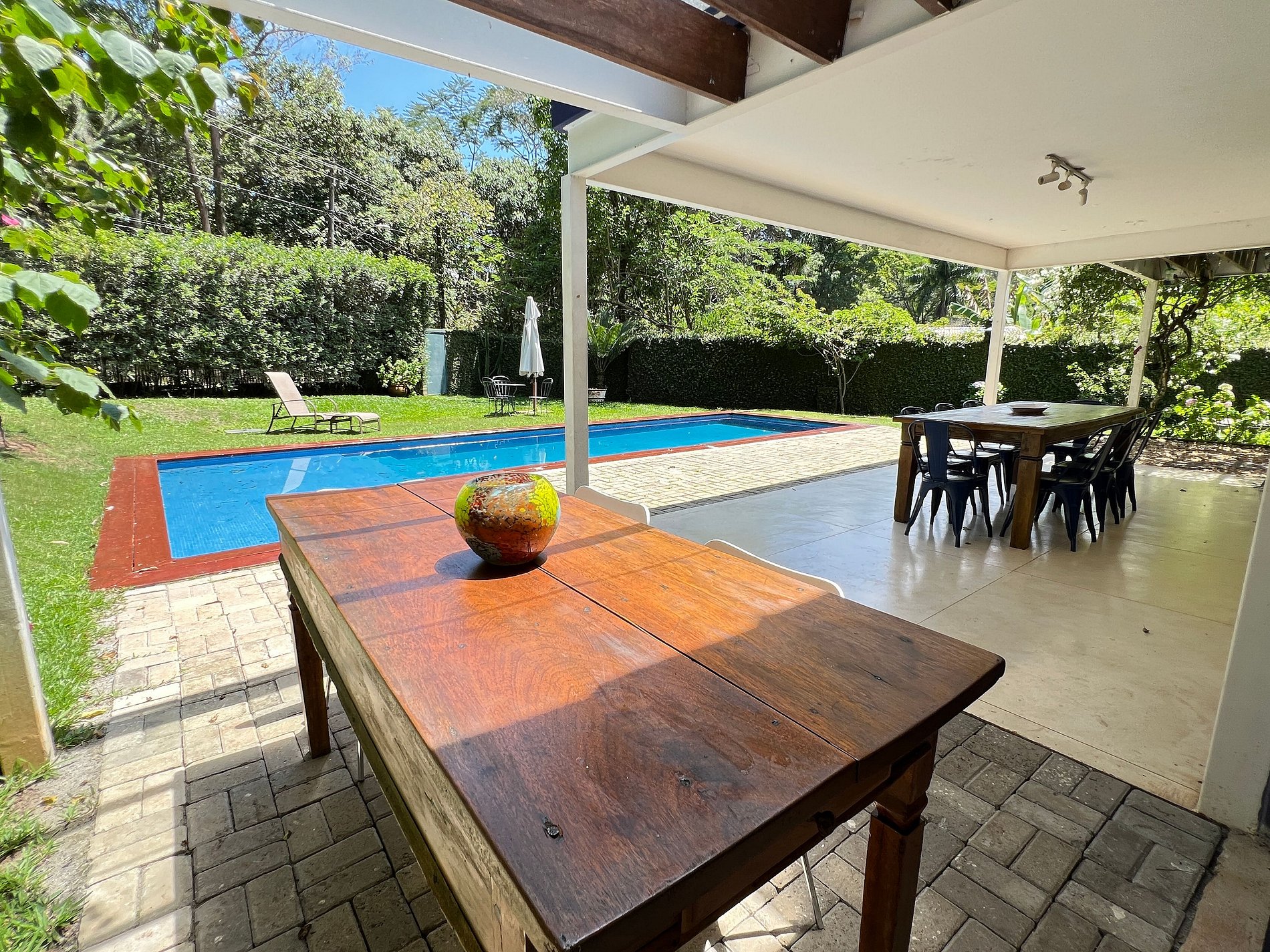- Varanda espaçosa com mesa de jantar para 8 pessoas e vista para a piscina.